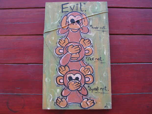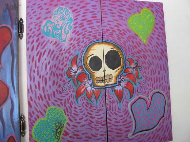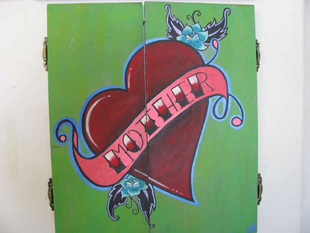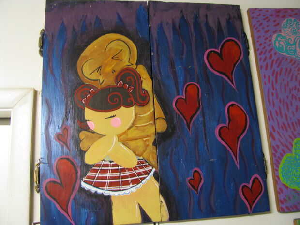 Cuando ella estaba en high School secundaria ella pintada en armarios de garaje hecha a mano de nuestro padre. Cuando nuestra gente se mudó tomé las puertas del armario y había colgado en mi garaje. Fotos de los gabinetes están incluidos en este post.