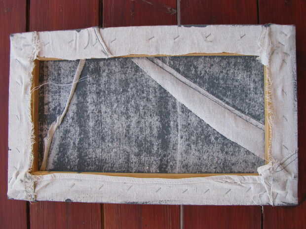 Ella empezó por rasgar un pedazo de tela en 3 partes y luego coserlos volver juntos. Luego hizo un marco y la lona estirada sobre él. Por supuesto ella había pintada antes de dar a mí.