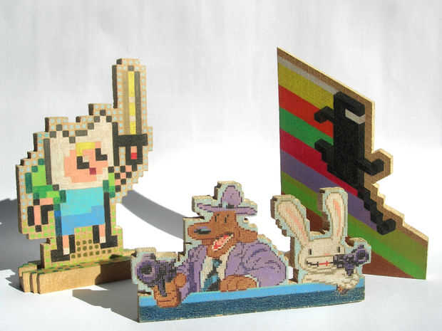 este instructable es un seguimiento a mi anterior, que era todo acerca de hacer pixel arte de madera, bastante pequeño así que usted puede decorar su escritorio con él. El objetivo de este instructable sigue siendo el mismo, pero el método es muy diferente. En el anterior instructable estaba sólo capaces de hacer tan pequeño como 6 x 6 mm algunos píxeles de forma aproximada. Un comienzo bien, pero que quería hacer mi píxeles mucho más preciso y sobre todo mucho más pequeño. Verás, mi plan original era hacer una versión en pequeña escala de arte pixel de Sam & Max: salir a la carretera, que pasa a ser mi juego de aventuras favoritos todos los tiempos :) El problema es... el arte del pixel que quería hacer era más de 120 pixeles de ancho. Si cada píxel tiene una anchura de 6 mm, que consigue algo más de 72 cm de ancho, que hace para una decoración de escritorio gigante.