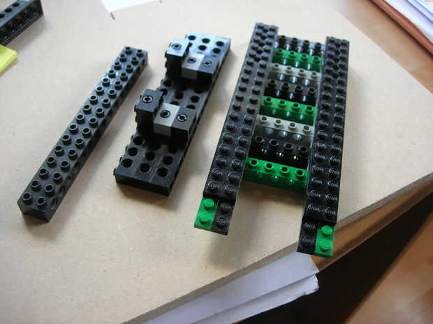 La cuarta y última imagen es un intento muy diferente para mejorar la longitud de las líneas que se puede cortar. Como se puede ver, las vigas son muy cortas, que parece un poco contraintuitivo, pero esta herramienta se utiliza de manera diferente. Se supone que use algo como un gramil, excepto que el cuchillo no es incorporado. Es decir, en lugar de mantener la herramienta en una posición fija, usted mueva la herramienta junto con el cuchillo, como usted la guía junto con el panel de madera. Utilizando la herramienta de esta forma funciona muy bien, como las vigas son muy cortos y por lo tanto muy resistentes. El único problema es que, como deslizar la herramienta sobre un panel de madera, algunas del color de los ladrillos de Lego es impresa en la madera. No miré más en esto todavía, pero supongo que fácilmente puede solucionarlo colocando unas cintas por debajo de la herramienta.