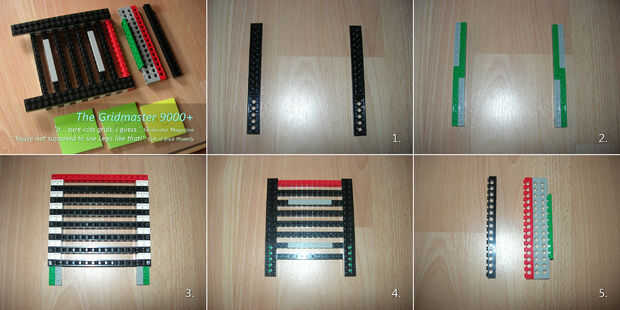 La herramienta de corte de red esencialmente consiste en un número de 1 x 16 Lego vigas conectadas entre sí, con 1 unidad de Lego de espacio entre cada viga. Usted notará que el conectar todas las vigas a las piezas planas van 3 unidades demasiado lejos. Esto se hizo por una razón: puede usar estas 3 unidades de longitud para snap en una guía, que también se puede poner en diferentes posiciones. Existen dos tipos de guías: haz único guía y una guía de triple haz. Ambos tienen un propósito diferente, lo que se explico en el paso 3.