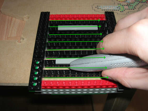 Una nota final sobre el uso de las guías: cuando se coloca la herramienta, empuje suavemente la guía contra todo lo que quieras alinear la TI; no ejercer demasiada fuerza en ella. Si lo hace, la guía comenzará a separar, y ya no es la herramienta en la posición correcta. También, mientras usted está cortando líneas, la mano que mantiene la herramienta trabada en su lugar debe sólo empuje hacia abajo; No empuje contra la guía o, otra vez, se comienzan a separar. Puede utilizarse para empujar contra la guía cuando se usa por ejemplo un cuadrado de acero, pero los que están hechos de acero, no Lego :)