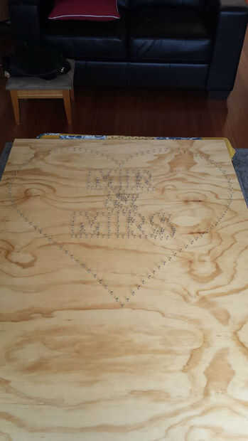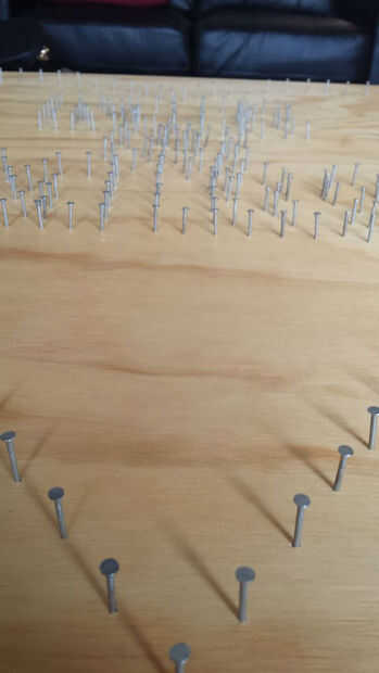Después de la plantilla en su lugar martillado en las uñas. Dejar la plantilla en su lugar mientras martillazos en los clavos había trabajado mejor para mí. Medí los clavos de 2 pulgadas aparte. Para hacer las uñas de la misma altura utilicé la columna un libro empujado contra el clavo como guía.