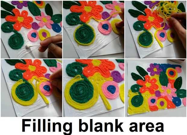 Después de completar el diseño principal es tiempo para rellenar las áreas en blanco. Hilado del palillo en las áreas en blanco para asegurarse de que el fondo blanco se cubre con hilo (ver la última foto de este paso).