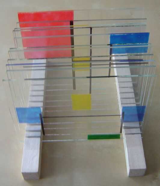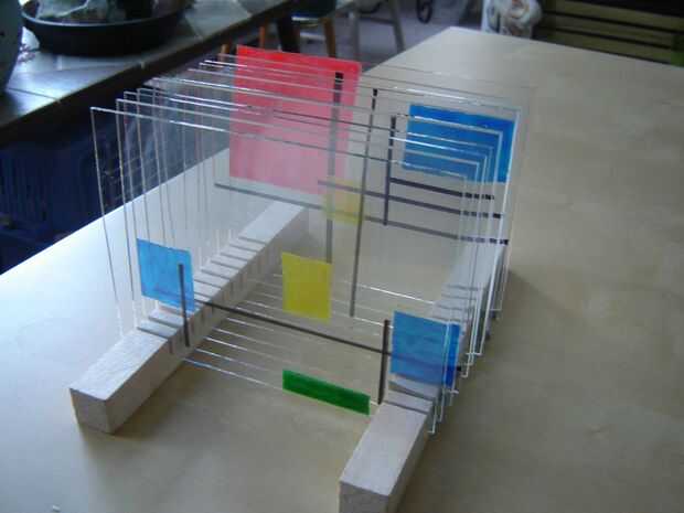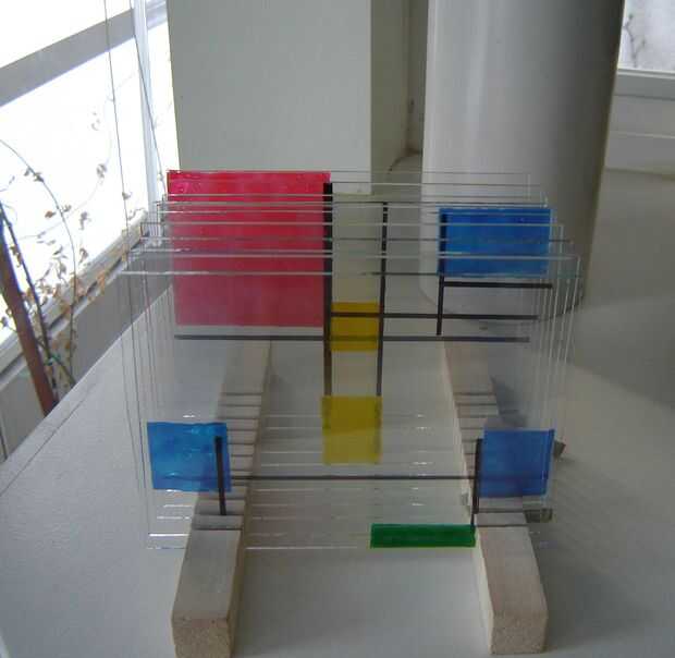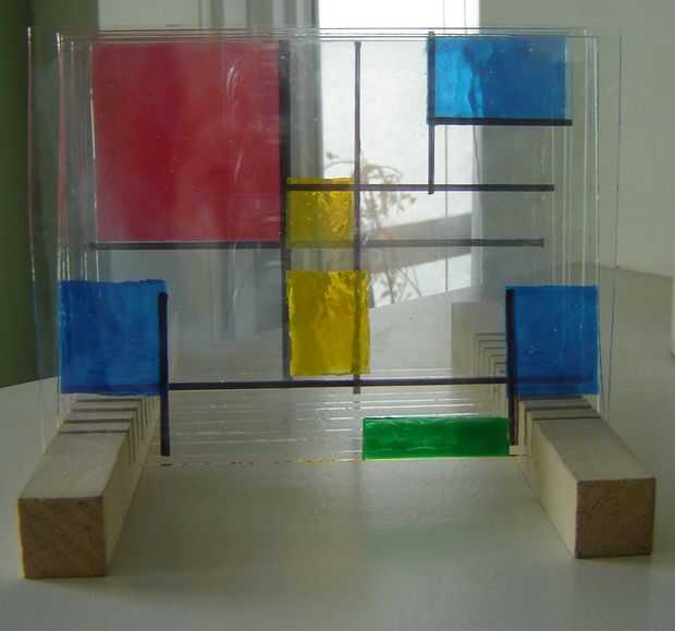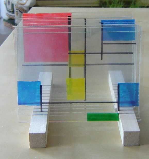 Corté el cristal en pedazos más pequeños para hacer una pintura dimensional cristal (básicamente pintura en capas de vidrio para crear un aspecto tridimensional.) El problema es que no tengo ningún talento artístico, pude dibujar ni pintar bien. Así que me decidí por algo abstracto, una imitación de Piet Mondrian, puesto que yo podía dibujar líneas y cuadros (siempre que tengo una regla, por supuesto).
