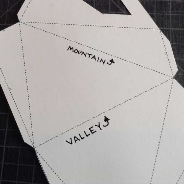 Una vez que han cortado sus formas, es hora de marcar todas las líneas de puntos. Marcar las líneas de ayuda a cada doblez nítida y recta. Para marcar las líneas, coloque una regla a lo largo de cada línea y dibujó encima de cada línea ejerciendo una presión firme en un bolígrafo (utilice una carpeta de hueso o un cuchillo muy aburrido si no quiere marcar su papel). Los modelos de pepakura tienen dos tipos de líneas de puntos. Guiones largos son pliegues de la montaña, lo que significa que el pliegue formará un punto convexo en la parte exterior del modelo (como una montaña). Guiones largos y cortos alternados son dobleces de Valle, lo que significa que el pliegue formará un punto cóncavo en la parte exterior del modelo (como un valle). Si está usando un bolígrafo para anotar sus líneas, con dos colores diferentes le ayudará Dile que los pliegues son montañas y que los pliegues son valles.