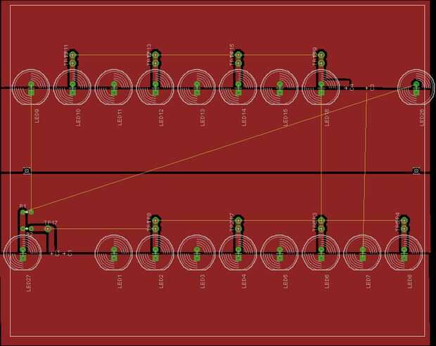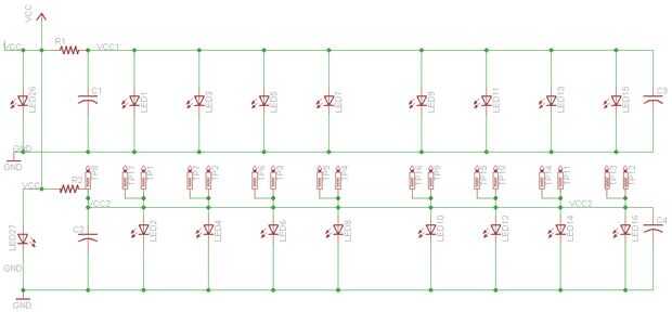 Este fue un circuito muy simple para hacer: una matriz de parpadeo de LED en paralelo. He utilizado parpadeo LEDs de Evil Mad científico laboratorios. Experimentó con una variedad de colores y por último utiliza una mezcla de alternando caliente blanco y fresco LED blanco detrás de los arreglos de discos de Flexivue. Acausa del parpadeo LEDs tienen chips de controlador integrado, que no necesitan resistencias limitadoras de corriente y pueden ser conectados directamente a la tensión de impulsión (aquí, 4 baterías AA en serie de unos 6 voltios). Hice un circuito impreso de 4 "x 5" en el Othermill, en dos piezas que luego bandsawed por la mitad y juntas soldadas longitudinalmente en un tablero de 2 "x 10". Quería ser capaz de controlar individualmente la luminosidad de los LEDs blancos cálidos y fríos, así que los pongo en dos circuitos paralelos. Cada circuito tiene un potenciómetro de 5K en serie como un atenuador.