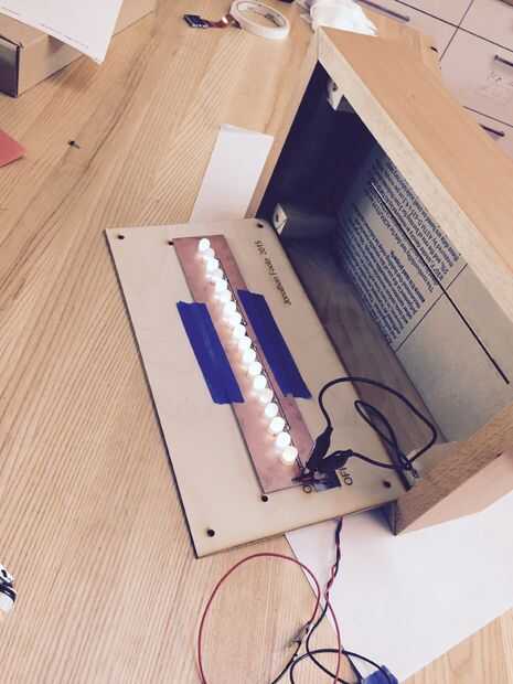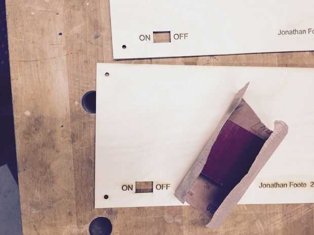 I laser-corte la parte trasera de contrachapado de abedul de 1/8 de pulgada, entonces enarenado apagado las quemaduras del borde. También Perfore los orificios para el interruptor atenuadores ollas como el 4 6-32 tornillos que fijan a la caja de madera y dos agujeros adicionales para el cable colgante. Entonces él con había acabado con lija de grano 600 para un acabado liso. Para verificar los LEDs fueron la altura apropiada, me temporalmente fijada la placa de circuito con cinta y cerré la caja para comprobar lo que parecía desde el frente.