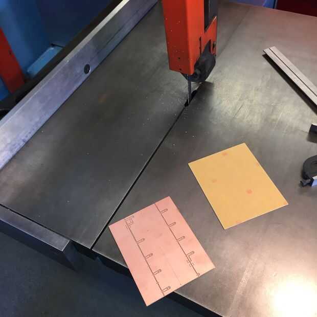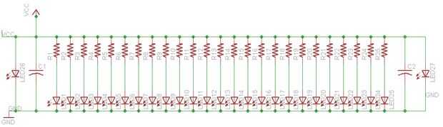 Este circuito era muy sencillo: una serie de LEDs blancos en paralelo, con resistencias de limitación actuales individuales. He utilizado 603 LEDs blancos de montaje superficial y 805 resistencias. Había fabricado el tablero en el Othermill, fue muy rápidamente. Para obtener la proporción largo me puso el circuito en dos mitades por una pieza de 4 x 5 de la placa de cobre de un solo lado, entonces bandsawed apart y había soldado ellos junto end-to-end. (Tenga en cuenta el esquema es un poco engañosa: no se utilizan los LEDs en los extremos, sólo usar la huella como un patrón conveniente de la cabecera para los cables de la batería.)
