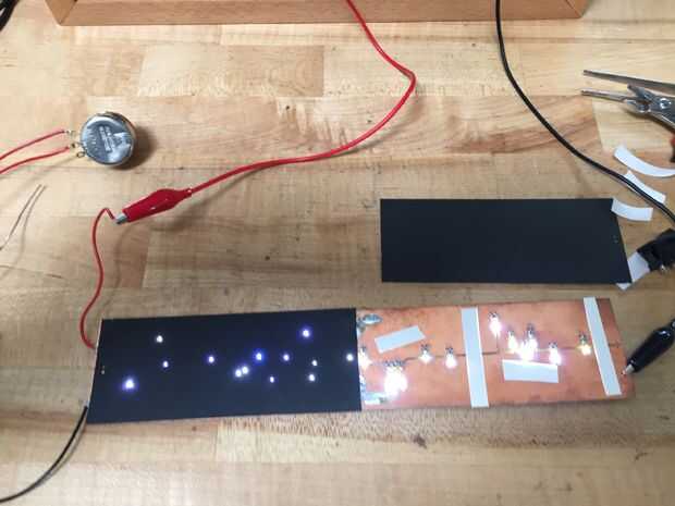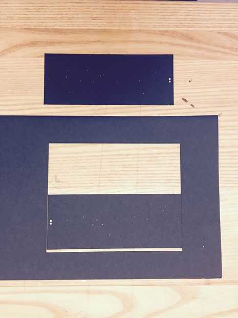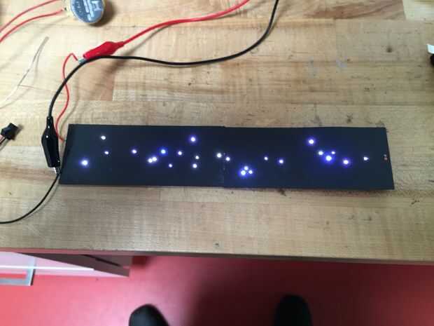 Estaba esperando que los 603 LEDs sería lo suficientemente pequeños como para parecerse a fuentes estelares; por desgracia no. Primeros experimentos demostraron que la caja rectangular del LED era bastante visible. Para conseguir una iluminación más punto como hice una máscara de estrella con agujeros de alfiler en cada posición de la estrella. Esto se hace fácilmente desde el en formato EagleCad: exportado la capa con las posiciones del centro de LED como un DXF entonces utiliza un láser de corte para hacer pequeños agujeros en el centro de cada LED. Os adjunto esta el tablero de circuito con cinta de doble cara. Para asegurarse de que yo alineado correctamente la sujeté con lo LED encendidos: fue muy gratificante precisamente alinear los agujeros con las luces :)