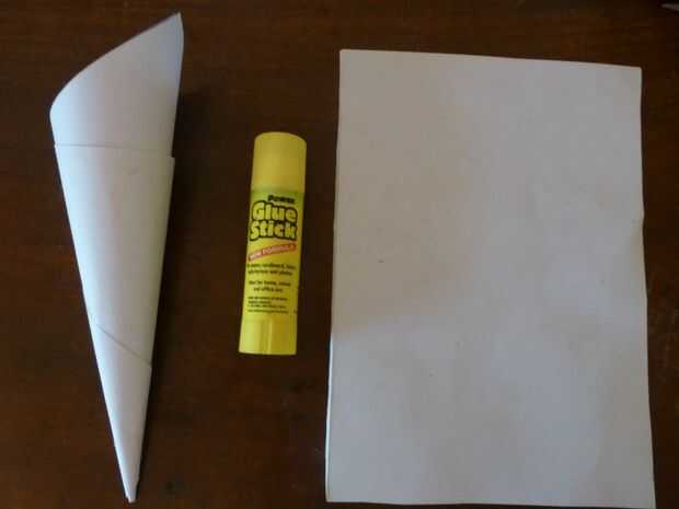 4. doblar una mitad en un cono y pegar las juntas con un palillo de pegamento. La otra mitad puede usarse esta última.