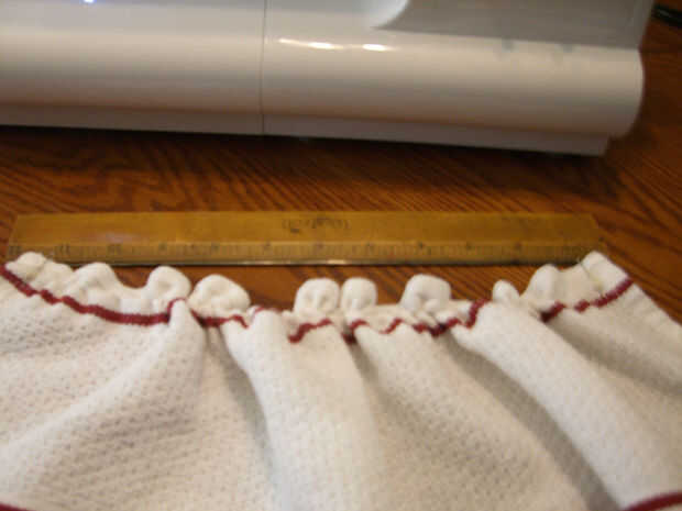 Continuar recogiendo la tela hasta la anchura superior es de 12 pulgadas. Ajustar y distribuir uniformemente los frunces y coser a través de la reunión para asegurarlo en su lugar. Retire el hilván.