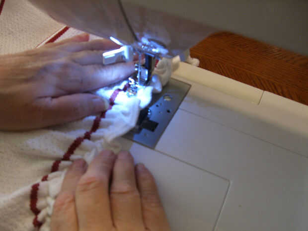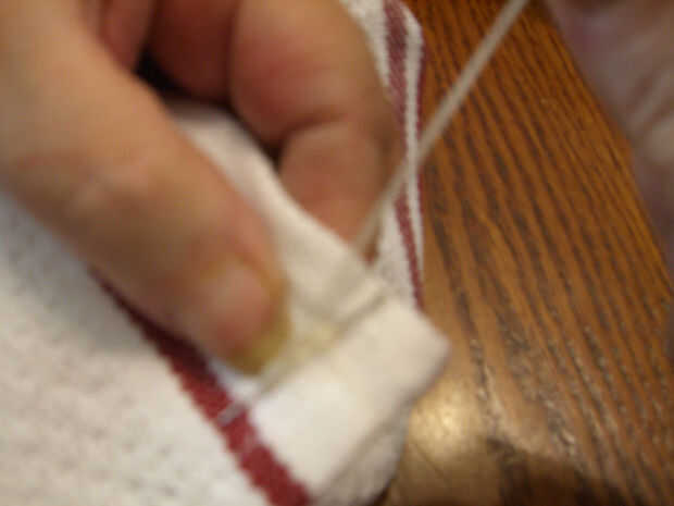 En un extremo de la toalla Inserte un alfiler y envuelva las roscas en una figura de ocho alrededor de las piezas del perno que sobresale. Desde el otro extremo Levante y tire suavemente la parte superior hilos de hilván para que no rompan, deslizamiento y agrupar a la tela hacia el extremo anclado.