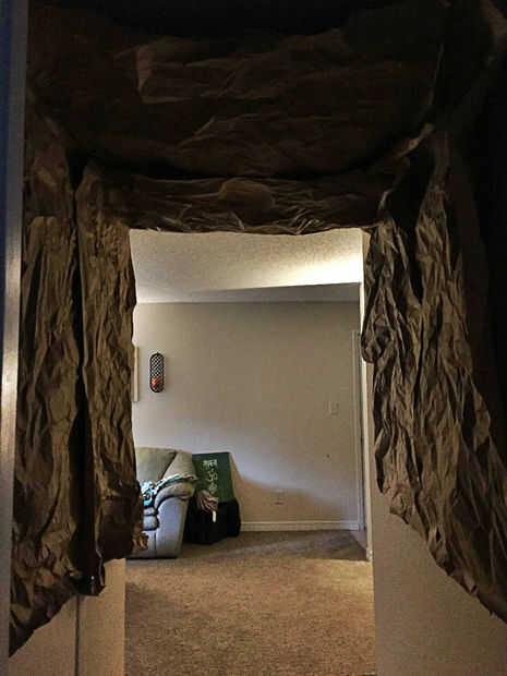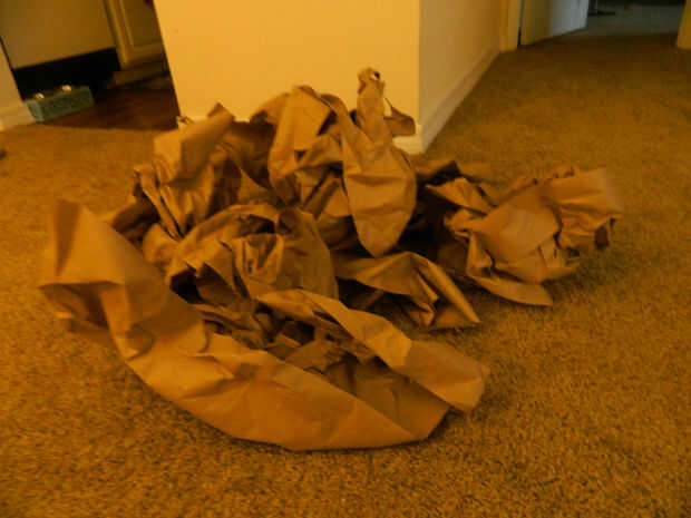 El siguiente paso es simple. Primero necesitará arruga el papel que se corta solo. Esto es importante porque le dará ese aspecto rocoso que cuevas. Después de que ha sido arrugado el papel, el siguiente paso es grabar las piezas a la pared y el techo (de su espacio designado cueva). He pegado dos piezas a cada lado y dos en el techo y asegurado con cinta adhesiva cada pieza a la pared y a las otras piezas para asegurarse de que permanecía puesto. Esto es importante porque no quieres tu cueva de papel a caerse las paredes en medio del proyecto (especialmente cuando se utiliza lápiz de pintura mojada/blo).