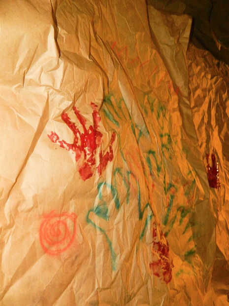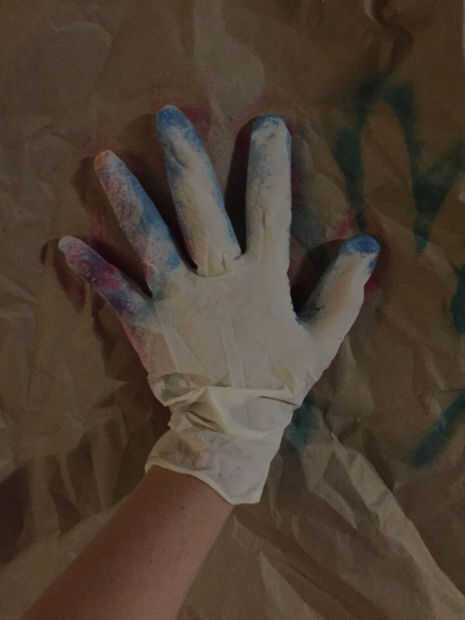Ahora que su cueva se ha creado, es tiempo de hacer el punto entero de este proyecto: el arte! Aquí es donde los guantes mano porque puede ser un poco desordenada. Coloque su mano enguantada en un lado de la 'cueva' y salir de la pluma de blo. Al usar el lápiz blo (en cualquier color de su elección; Me decidí por la azul), se centran en conseguir la pintura alrededor de la mano para asegurar que deja el trazo de una mano impresa en el papel. Usted puede hacer esto tantas veces como quieras en tantos colores como quieras! Mi pluma de otros blo no estaba cooperando para que el azul fue lo que utilicé principalmente.