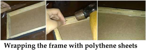 Coloca el papel del arte en el marco de madera (parte delantera) y envolver con las hojas de polietileno claro (sólo la parte delantera). Ahora utilice un martillo y unos clavos para sujetar la hoja de polietileno con el marco.