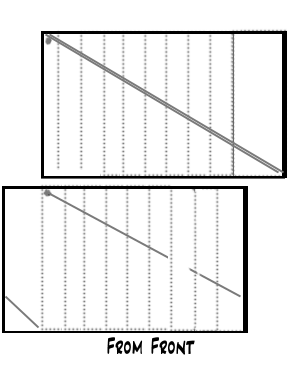 Gira ambas hojas. Dibuja líneas para ayudar a organizar las tiras si deben recibir desordenadas después de que se cortaban. En la hoja superior, realizar dos líneas diagonales derecha al lado del otro desde el punto (ahora en la parte superior derecha) en la esquina inferior izquierda. En la hoja inferior, trace una línea diagonal solo desde el punto de abajo y a través de la página y el borde. Luego empezar de nuevo desde el otro borde e ir a la marca de corte inferior.
