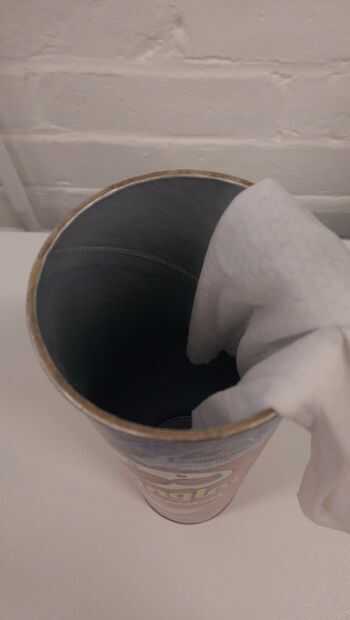Toallitas de limpieza de cocina son la opción rápida y fácil y hacen un buen de trabajo deshacerse de los residuos. Alternativamente, puede utilizar un cepillo para botellas y un poco de jabón y agua para lavar afuera, sólo no dejan la lata en remojo ya que es sólo cartón. Si utiliza la opción de lavado, asegúrese de dejar la lata de aire hasta que esté completamente seca antes de pasar al siguiente paso.