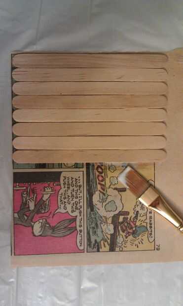 Línea de palitos a lo largo de una superficie resistente al agua y pincel sobre modge podge añadimos la imagen cómica o solicitada a la superficie
