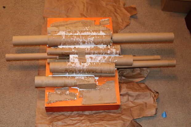 5. Abra su cola blanca. Me quité la tapa. Lanzaban cola hacia atrás y hacia adelante de derecha a izquierda haciendo líneas delgadas y gruesas el pegamento al Charco y por goteo. Más pasa con el pegamento los charcos más y líneas a través de los tubos. No tengas miedo a la cucharada encima de grandes charcos de pegamento con su cartón corrugado usando el exceso de pegamento para pegar abajo las piezas de cartón corrugado. El pegamento se seque bultos y hacer cantos a la textura de la superficie.