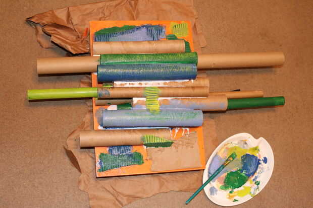 3. comience primero con colores mates. Cubrir los tubos, las áreas entre los tubos que se pueden ver, el interior los extremos de los tubos y el cartón corrugado con un buen abrigo. Utilice una técnica de pincel seco para resaltar los bordes de la textura dejada el pegamento seco y pudelado.