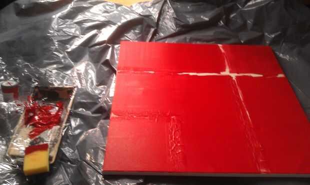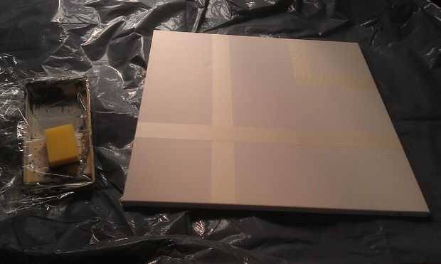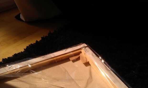 1. las telas tengo vinieron en pequeños envoltorios de plástico. Si se corta desde el centro de la parte posteriora diagonalmente hacia fuera en las esquinas, es producir una lámina de plástico aprox 1.5 veces más grande que la tela en cada sentido. Esto le permitirá mantener el lienzo al mismo tiempo enmascarar y estirar la lona.
