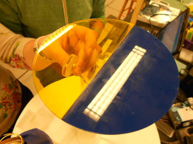 Sus dos semicírculos acrílico (uno azul, uno amarillo) y las combina para formar un círculo completo usando pegamento de acrílico. Encontrar el centro del nuevo círculo y coloque el acrílico transparente de diámetro 1" círculo allí. Se trata del apoyo que tiene el acrílico sobre la espiga de aluminio que gira. Probar el acrílico en la espiga y ver si se ajusta bien. Si no, puede utilizar algunos cables retráctil en la parte superior de la espiga para que se ajuste más cómodamente.