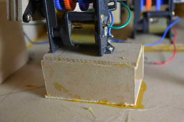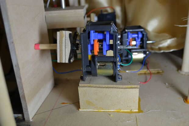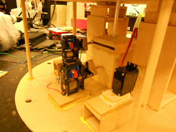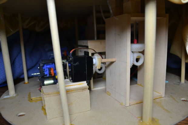 5.) eje de conectar por medio de madera entre el eje motor y autómata. Lo hicimos super pegado del árbol autómata en el soporte de madera y atornillando el eje de la caja de cambios al medio y en el caso del motor servo super pegado el medio al árbol del motor. pegar la parte inferior de la plataforma a la base.