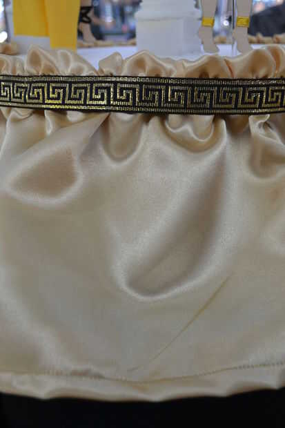 Siga los mismos pasos con la segunda pieza de tela. Una vez que tienes ambas piezas puede conectar a la etapa. Alinee el el fruncido líneas en la parte no brillante de la cortina con el borde de la etapa de la puntada y utilice pegamento caliente para sujetarla. Cortar una longitud apropiada de su cinta favorita de inspiración griega y pegamento caliente a lo largo de las puntadas de fruncido el lado brillante.