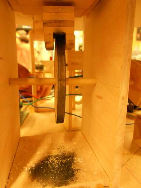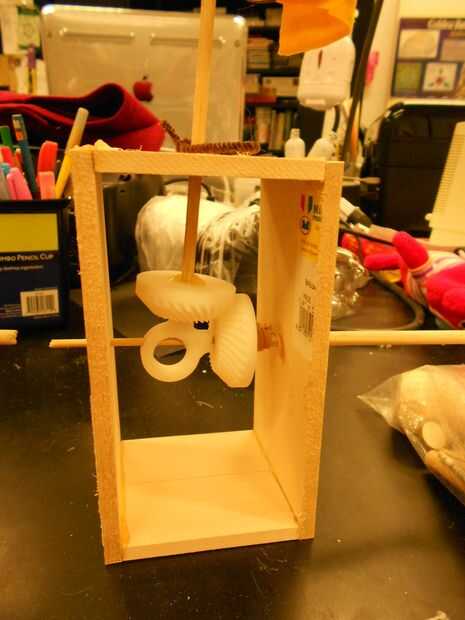 Para fijar dos bailarines a cada mecánica, construir fuera de la caja. En primer lugar, soporte de dos paredes, que tiene un agujero a cada lado de que pase el eje, la madera de la parte inferior. Después de pegado de fondo y las paredes laterales, inserte una clavija de madera fabricar cam con un orificio central de la misma para Artemis y fabricar los dos engranajes impresos 3D para Apolo. Después de la fabricación de ejes y fuera de la caja, cubra el extremo del eje horizontal para fijar con el abrigo del alambre y también fijar dentro del árbol con hilo para que no se mueva de lado a lado.