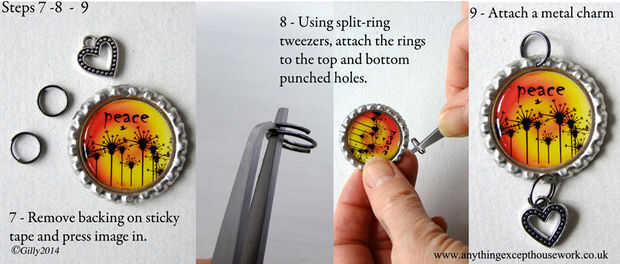 Usando sus alicates de anillo partido, abrir los anillos de división y que encajen en los orificios superior e inferior en el borde de la tapa de botella. Puede usar la uña del pulgar para abrir los anillos pero si haces un montón de estos, se encuentran las pinzas mejor.