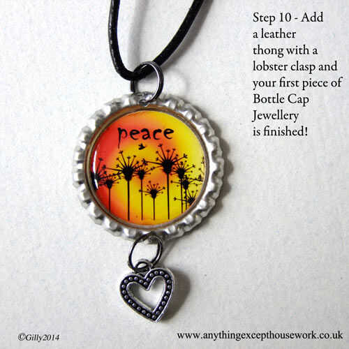 Pasos 8 y 9 fueron cubiertos de una sola vez con la foto del paso 7. Así que esto realmente paso 10! Añadir una correa de cuero con broche de langosta y una longitud de elástico de 1mm negro atado en un nudo y ahí tienes la primera pieza de joyería de tapa de botella para usar, vender en ferias artesanales o dar lejos como regalos.