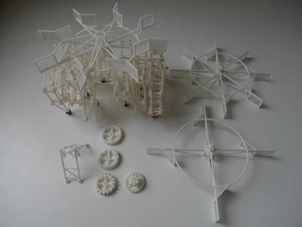Ahí lo tienen. Ahora todo lo que tienes que hacer es enviar a conseguirlo impreso (a menos que usted es bastante afortunado tener acceso a una máquina SLS). Dependiendo de qué tan preciso es el modelo de referencia, y qué tan bien han permitido la cantidad correcta de tolerancias, su turbina Strandbeest podría caber perfectamente en la primera impresión, o puede que tenga que hacer un poco de volver a modelar. No es raro tener que ajustar e imprimir un diseño varias veces para llegar al punto donde estés feliz con él.
