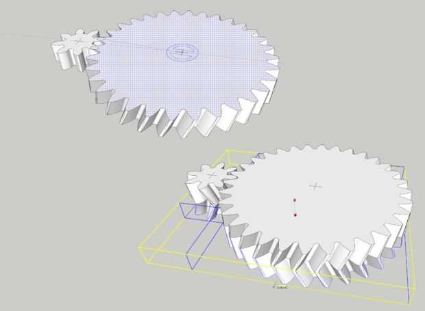 Con el engranaje espiral plugin para Sketchup, es muy sencillo generar un perfil de cambios basado en unos parámetros de entrada y luego vaivén el perfil crear un simple engranaje de estímulo.