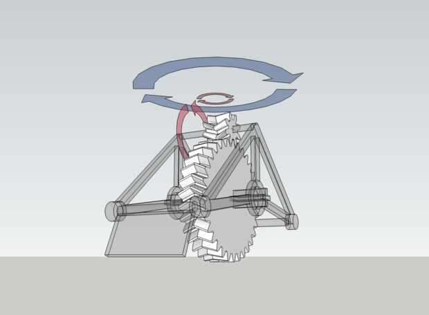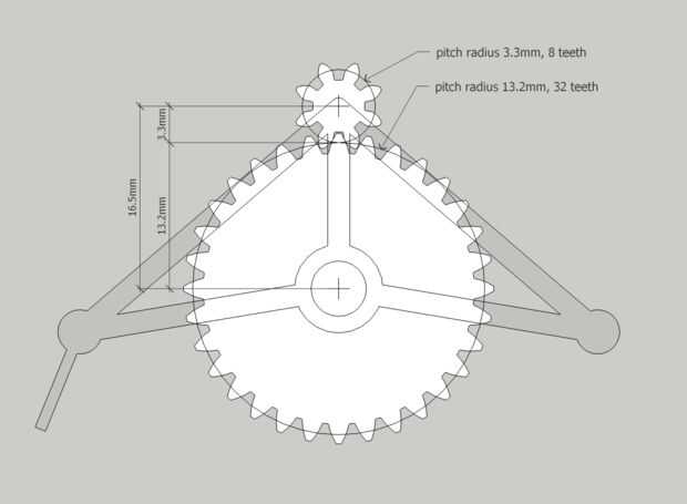Para este par de engranajes, usamos un paso abajo cociente de 1:4, así que 4 revoluciones de los engranajes pequeños = 1 revolución del engranaje del eje impulsor. Esta relación se aplica al número de dientes en cada engranaje (8:32) así como el radio de la echada de los engranajes (3.3 mm: 13.2 mm). Se calcula el radio de la echada para cada marcha de la distancia entre el centro de dos engranajes, es decir la distancia entre el eje y el eje.