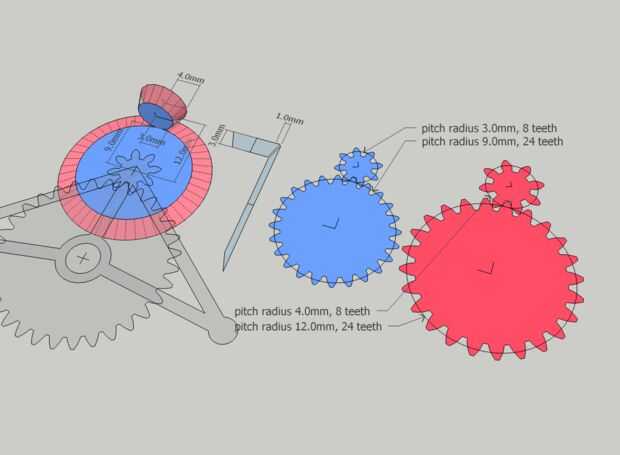 Vamos a utilizar un paso abajo cociente de 1:3 esta vez, debido a la restricción de tamaño en el engranaje más grande desde donde se sienta en el árbol. Junto con los engranajes del paso anterior, tenemos un general paso 1:12, dar 12 revoluciones de la turbina a 1 revolución del eje impulsor Strandbeest. El número de dientes y de paso radios seguirá la relación 1:3 - (8:24 dientes, dentro de 3 mm: 9 mm, fuera de 4:00 mm), y otra vez utilizaremos 25deg para el ángulo de presión.