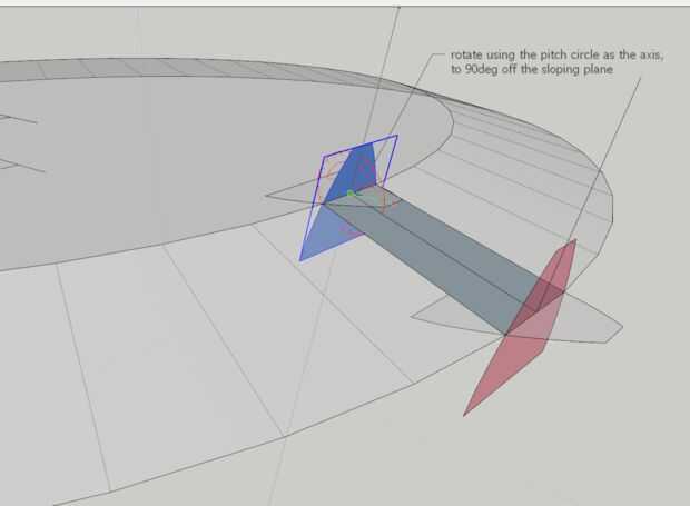 Ambos perfiles del diente entonces necesitan girar para ser perpendicular al plano mallado, usando el círculo de la echada como el eje de rotación.