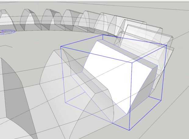 Usando el plugin de curviloft, entonces podemos participar los 2 perfiles de diente rotado para formar 1 diente de nuestro engranaje cónico. Copia esto gire a lo largo de 15° (360° / 24 dientes) para establecer la posición de los dientes próximos, por lo que podemos añadir en una cara a la depresión entre los dientes del 2 engranaje.