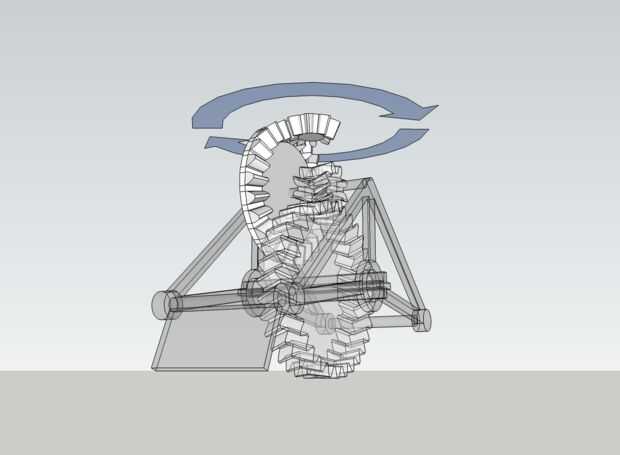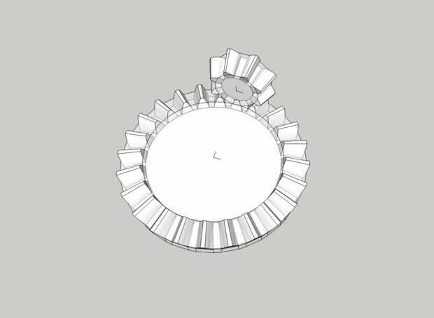 Tenemos un juego más de engranajes para crear, y es un poco más difícil. Este es el par de engranajes cónicos en la parte superior que la transferencia de rotación del eje vertical de la turbina al eje horizontal de los engranajes. Además, también queremos que este par de engranaje a.
