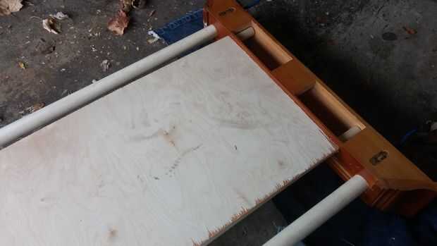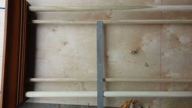 Junte la unidad ensamblada en algo plano (utilicé la madera que utilizaba para el respaldo) y mida la distancia entre los dos tacos más finos. (en mi caso 12 3/4")
