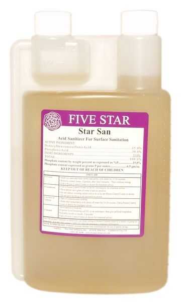 Usar Starsan (también desde su tienda homebrew). Starsan es un desinfectante "sin aclarado", así que es fácil de usar. Sólo tienes que seguir las instrucciones en el envase.