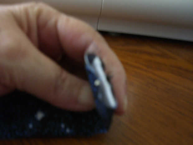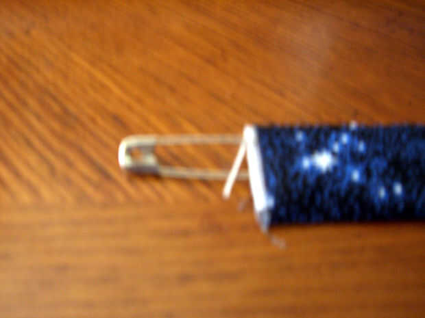 Coloque un alfiler grande a uno de los extremos del elástico. Deslice el perno de seguridad con el elástico conectado dentro de la guía de la correa y empuje el tejido hacia abajo sobre el perno de seguridad hasta que sale el otro extremo, teniendo cuidado de no hacer la torsión elástica dentro de la correa.