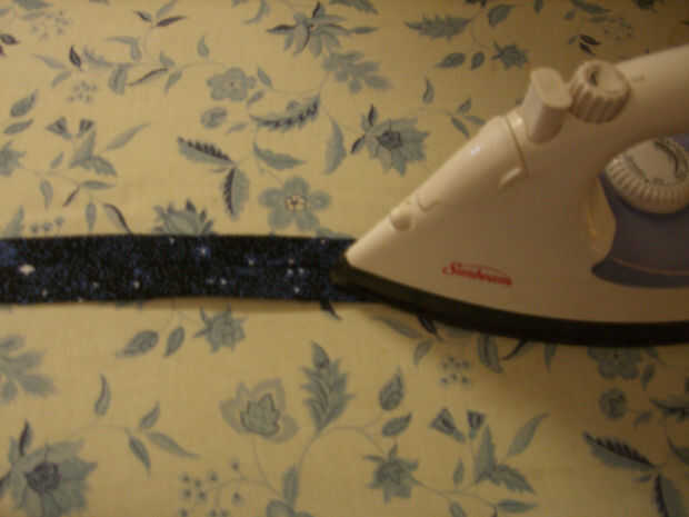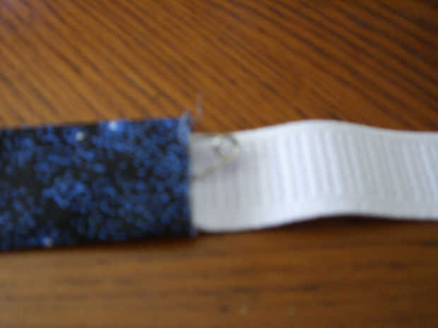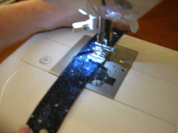 Estirar la correa hacia fuera todo lo que va a ejecutar a1/4 de pulgada de la costura a través de la tela y elástico a ambos lados de la correa. Ponga a un lado.