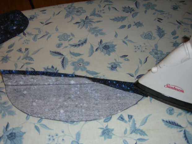 En ambas piezas doble y presione dos veces un dobladillo de 1/4 de pulgada. En la parte superior de la máscara de nuevo doblez de la pieza otra vez en la línea marcada y prensa.