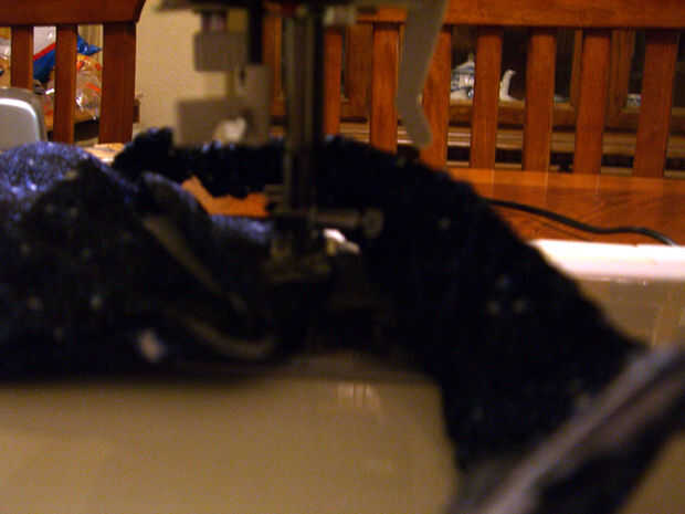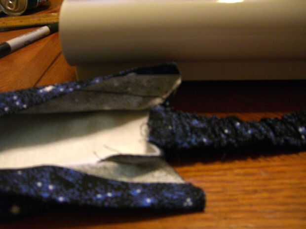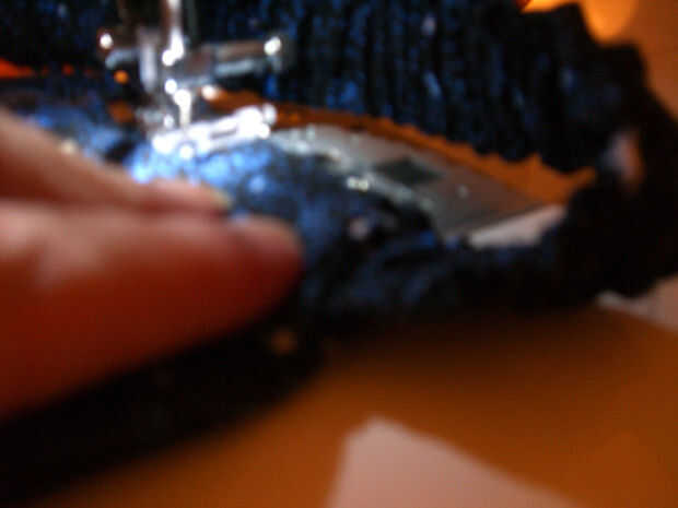 A partir justo detrás de la puntada de correa lo más cerca del borde que puede conseguir coger la primera parte de la correa y termina escondido en. Mantenga el extremo suelto de la correa detrás de la aguja por lo que es fuera del camino.