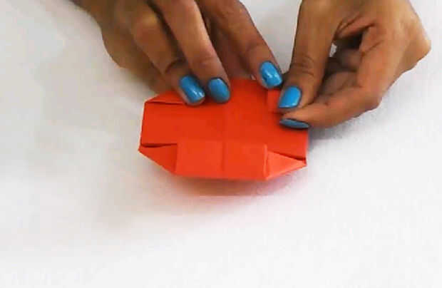 Abrir los dos opuestos de las aletas, presionando firmemente las esquinas y la cama de Origami con los dedos de la forma.