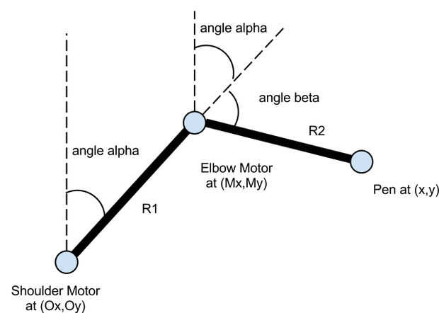 En el dibujo anterior, la alfa de ángulo es el ángulo del primer brazo del eje y y ángulo beta es el ángulo del segundo brazo de la línea la sigue a la primera dirección de brazo. Estos son los ángulos de que los servomotores se utilizan como su valor o su posición. R1 y R2 son las longitudes de brazo primera y segunda.