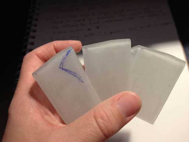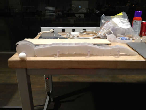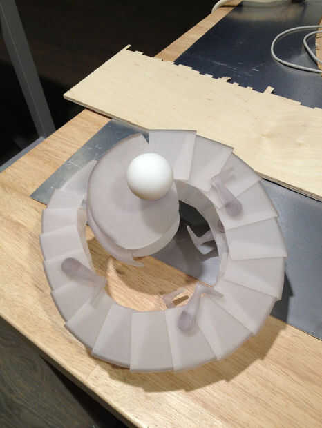 Después de dibujar todos los segmentos, la cabeza, las piernas, agregando los agujeros las piernas a los segmentos 4, 9 y 14, imprimí todas las piezas en Objet Connexes del laboratorio Instructables, utilizando el "Vero" claro resina. Para el primer intento no fue malo, pero había una serie de problemas. En primer lugar, simplemente no rizar lo suficiente! (Parecía más a un feto de algún tipo de un Curl-up). La cabeza no era lo suficientemente suave para mí, el pico fue proporcionado mal y las piernas no apoyan como mantiene caída (expliqué en el paso de las piernas sobre la adición de un reborde para evitar esto). Pero sin embargo fue un gran hito.