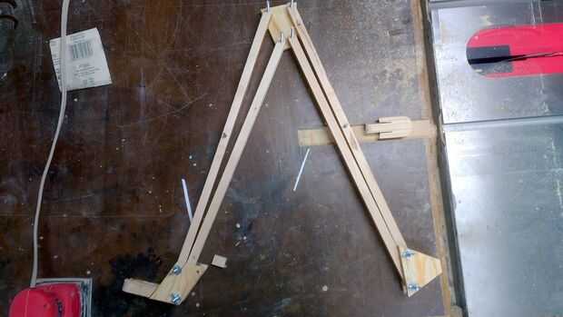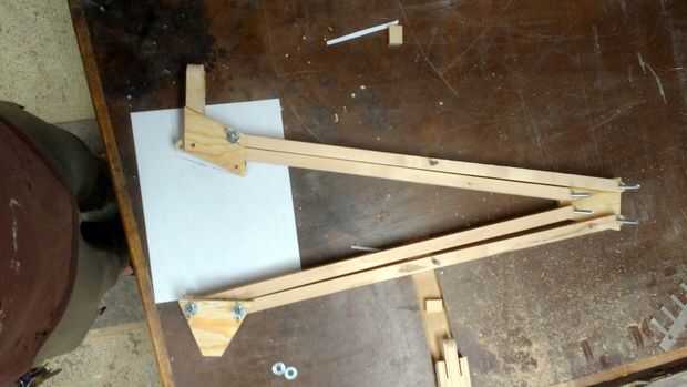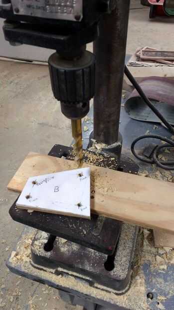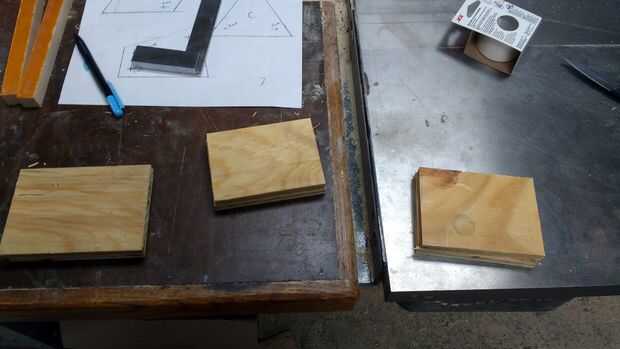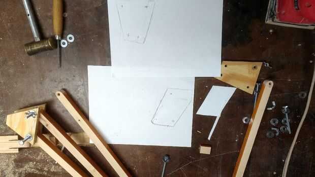Pegar las plantillas a la madera contrachapada y utiliza la cinta de la alfombra para mantener Unidas dos piezas. Banda de aserrado de las juntas, luego centro perforado los puntos de pivote y marcados y centro perforado los pivotes en las extremidades. Dos de los miembros consigue un 1/4 agujero en el medio así.