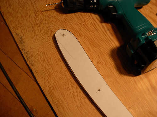 Colocar cada par de piezas idénticas hacia fuera con el patrón en la parte superior y hasta bien. Taladre agujeros piloto donde marcaste las bisagras.